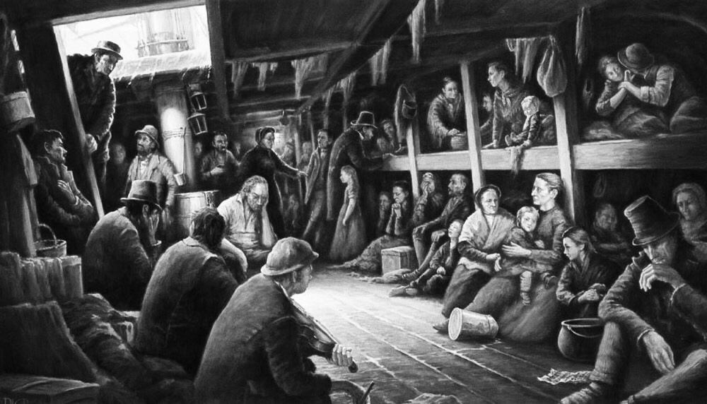 Small, barely sea worthy vessels, crammed with skeletal families, broken and ravaged by disease, still hoping for a better life. Conditions on board were horrific. The journey would take up to six weeks, with only communal buckets for sanitation. Cholera and Typhus were rife and many would die onboard, their rotting corpses a stark warning of what may come to those watching and breathing in the stench of death, until the bodies of loved ones were tossed unceremoniously overboard.